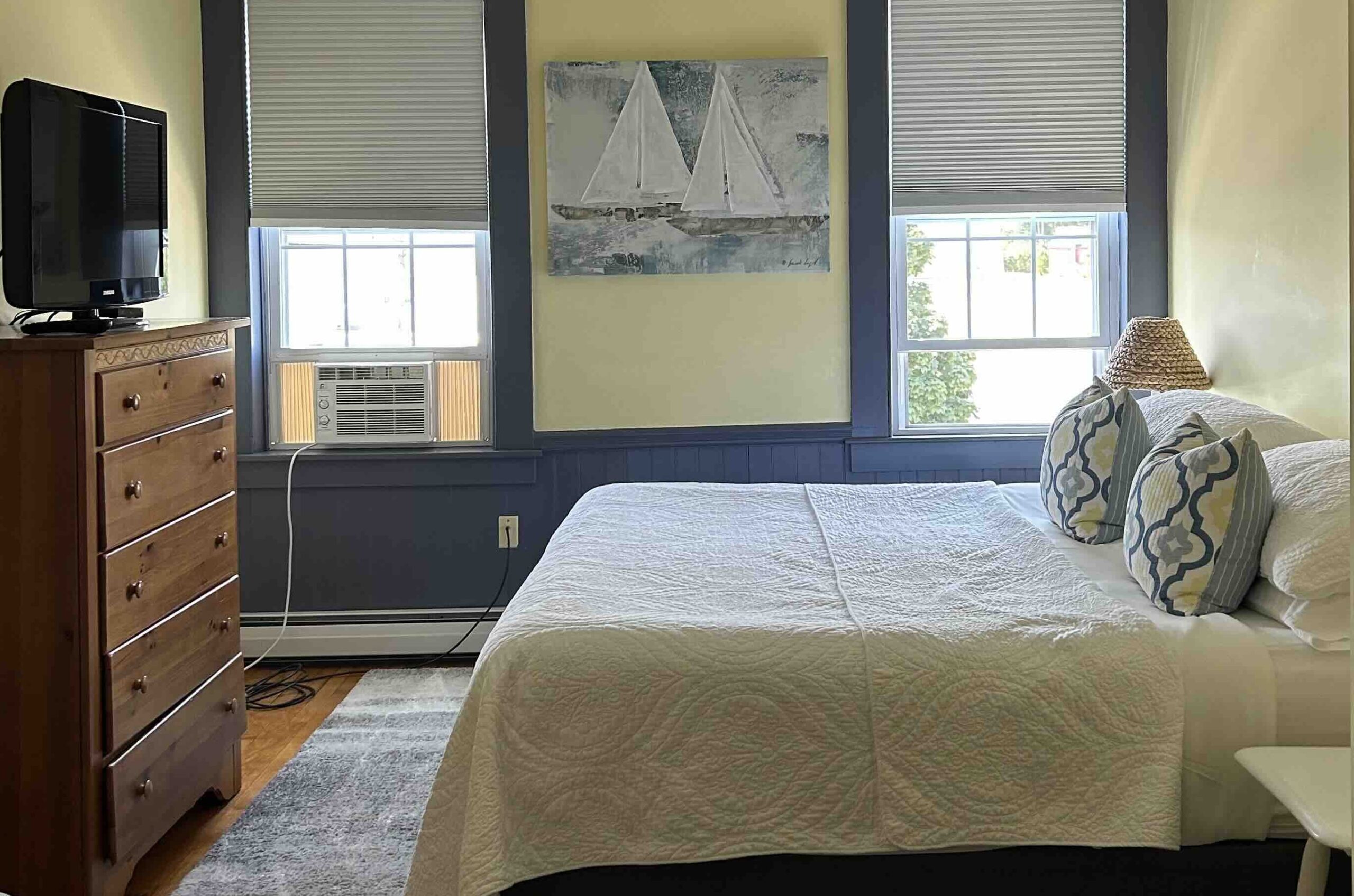 This suite has two bedrooms with a king bed in one bedroom, twin beds in other bedroom and a daybed with trundle in the living area. Includes a fully equipped kitchen, living area, private bath, cable tv, and free wi-fi. Sleeps up to 6 people.